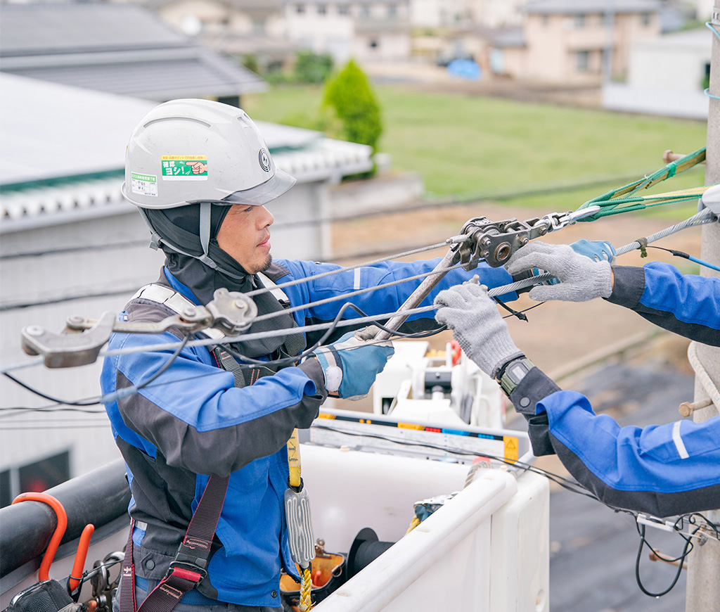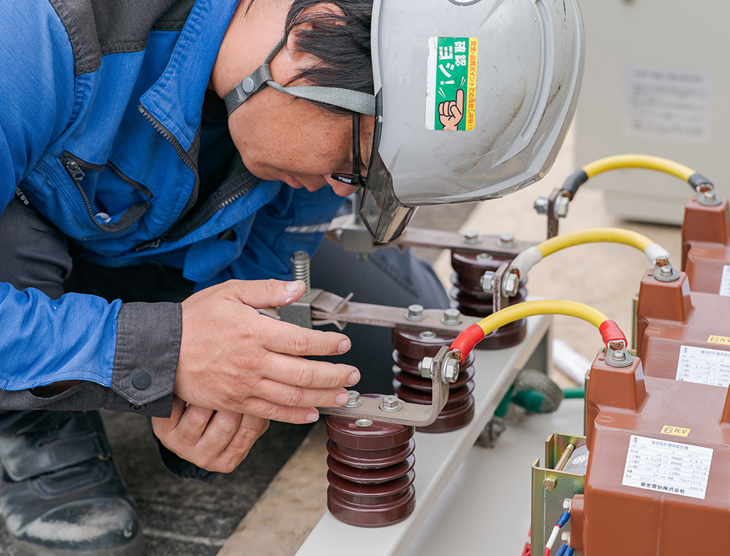 私たちは、電力会社の変電所設備の点検・更新工事をはじめ、配電設備の新設・改修、地中電力ケーブルの布設・接続、低圧引込線工事など、暮らしや産業活動を支える基盤となるインフラ整備を行っています。